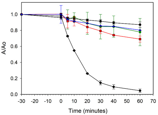 UV photooxidative degradation of methylene blue dye in air using ZZ-ZnO (black diamonds), ZZ-Co(1%):ZnO (red squares), ZZ-Co(5%):ZnO (blue triangles), and ZZ-Co(10%):ZnO (green circles). A blank methylene blue solution without catalyst is also shown (black circles).