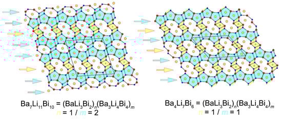 Considering the similarities between the “4-7-6” and “7-11-10” structures, it can be proposed that the two are members of a homologous series. Let us illustrate this idea by taking two compounds with known structures—Ba3Li4Bi4 (Zr3Cu4Si4 structure type, Pearson symbol oI44) and BaLi3Bi2 (LaLi3Sb2 structure type, filled version of the CaAl2Si2 structure type, Pearson symbol hP6). We draw attention to the fact that the existence of the former compound has been experimentally confirmed, but the latter is not known. For electronic stability reasons, as discussed in the next section, BaLi3Bi2 is not likely to form, and its closest analog would be EuLi2.58In0.42(2)Bi2, which was obtained as a part of this study (see the Supplementary Materials). For comparison, the isotypic lanthanide-based RELi3Bi2 are valance-precise semiconductors, whose formulae can be represented as (RE3+)(Li1+)3(Bi3−)2, and they can be readily made [31]). Nonetheless, for the purposes of this discussion, BaLi3Bi2, even as a hypothetical case, will be considered, and slabs cut out from Ba3Li4Bi4 and BaLi3Bi2 can be integrated to form Ba4Li7Bi6 following Equation (1):