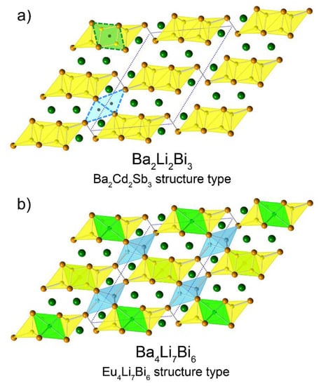 In the course of the study, several other new phases were serendipitously encountered. These include BaLiBi, Ba(Li1−xInx)2Bi2, Sr3Li3GaSb4, Sr3Li3InSb4, and Eu(Li1−xInx)Li2Bi2, among others that are still unknown. Structural work to fully elucidate the structures of the above-mentioned compounds is ongoing. Preliminary data for Eu(Li1−xInx)Li2Bi2 (isotypic to LaLi3Sb2, a “filled” variant of the CaAl2Si2-type) is given as Supplementary Materials, since this structure is a building block of the herein discussed “4-7-6” and “7-11-10” structures.
