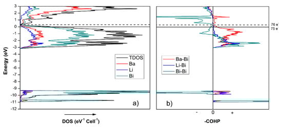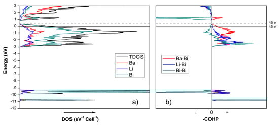 The Li–Bi bonds are optimized, reflecting the strong covalent nature, while the Ba–Bi interactions are slightly underoptimized (electron-deficient) because there are still bonding states available above the Fermi level. This situation will not change even by adding more electrons, i.e., moving the Fermi level up to the gap. This scenario is not unusual for highly polar interactions with strong ionic contribution [42]. Similarly, the Li–Bi will not change much if the Fermi level were shifted up because only a few states are available above the Fermi level and are of anti-bonding character for the Bi–Bi interactions and bonding for Li–Bi ones. We can estimate that for both structures, the integrated –COHP values for the Li–Bi interactions lie between 0.1 and 0.4 eV per bond, while for the Ba–Bi interactions, they range between 0.4 and 0.7 eV per bond.