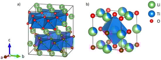 Li2TiO3 represents an interesting system for high energy ball milling because of the three known polymorphs that might be converted under the milling conditions depending on the energy impact. The monoclinic low temperature modification β-Li2TiO3 (Figure 1a) with space group C2/c has a layered structure with three different lithium sites and two different titanium sites and is isostructural to Li2SnO3 [6,7,8,9]. The cubic high temperature modification γ-Li2TiO3 (Figure 1b) with space group Fm−3m consists of a NaCl type structure with statistical distribution of Li+ and Ti4+ on the 4a site and Z = 4/3 formula units per unit cell (Li2.66Ti1.33O4) [7,8,9]. The β polymorph undergoes a reversible transformation to the γ polymorph at approximately 1150 °C [7,10]. A metastable cubic low temperature form with space group Fm−3m is obtained by hydrothermal reactions from LiOH and TiO2 in water and is denoted as α-Li2TiO3 [7,11,12,13]. An irreversible phase transformation from hydrothermally formed α-Li2TiO3 to β-Li2TiO3 occurs after heating above 300 °C [13,14,15].