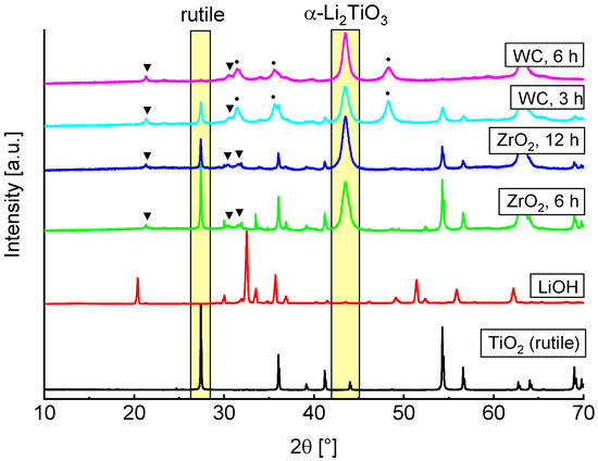 A faster formation of α-Li2TiO3 can be observed by use of WC milling tools. Rietveld refinements indicate an introduction of 2 to 4% crystalline WC from abrasion of the tools (marked by circles). After a milling time of 6 h no rutile reflections are visible, while these are still present after 12 h if ZrO2 tools are used. This is most likely due to the different hardness of the milling tools and the resulting variations in impact energies. There are already reports in the literature which indicate that the milling tools can have a large influence on the formation of different phases [3,24].