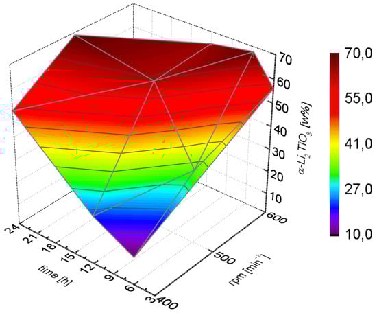 Higher amounts of cubic Li2TiO3 were only obtained after long milling times or high milling speeds (Figure 3). The cubic phase formed slowly at lower rotational speeds (400 rpm) and even after 24 h a portion of 50% was not exceeded. At high milling speeds (600 rpm) a portion larger than 50% was already achieved after milling for only three hours.