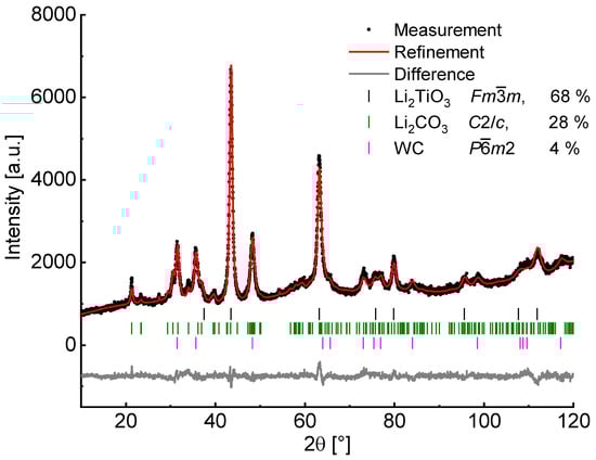 The percentage of α-Li2TiO3 after milling at 600 rpm for 6 h amounts to 68%, as analyzed by Rietveld refinement (Figure 4) neglecting possibly existing amorphous matter. Since Li2CO3 is still present after complete conversion of TiO2 and an increased baseline intensity is visible, a portion of amorphous material may be assumed. Handling of the milling product in a glovebox with subsequent measurement in an airtight dome sample holder (Rietveld refinement in Supplementary Materials Figure S2) reveals no crystalline phase of LiOH nor Li2CO3, therefore Li2CO3 is formed after the milling process from the amorphous material by exposure to air. Measurements with an internal standard (50% of α-Al2O3) led to the identification of approximately 35% amorphous content, which may contain missing amounts of TiO2.