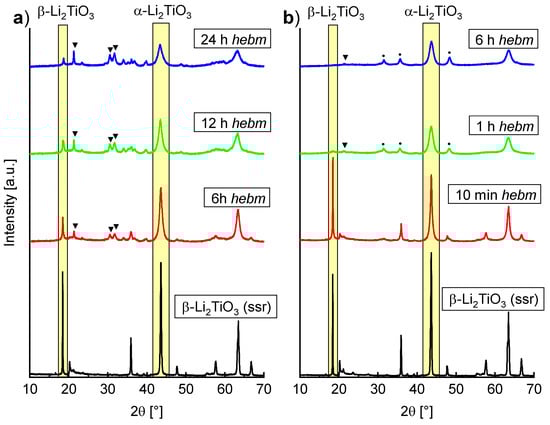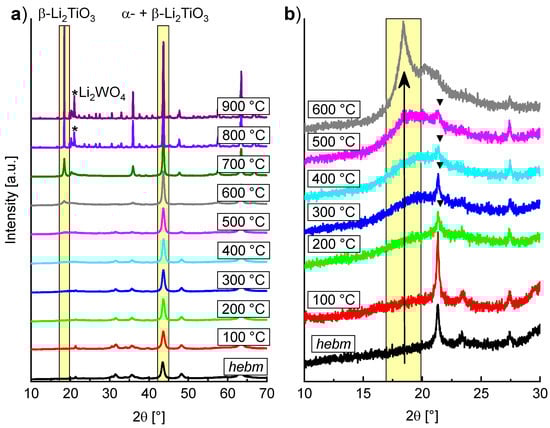 PXRD measurements of high energy ball milling (hebm) Li2TiO3 after heating to different temperatures for 1 h. (a) Main reflections of β- and α-Li2TiO3 are highlighted; (b) The arrow indicates the deployment of the (002) reflection of β-Li2TiO3 between 500 and 600 °C. Triangles indicate the main reflection of Li2CO3.