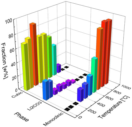 In the temperature range between 300 °C and 600 °C, a single fraction of β-Li2TiO3 was used in the refinements to estimate the proportion of cubic and monoclinic Li2TiO3. Starting with a temperature of 600 °C a three-fraction model for β-Li2TiO3 was used (described under Section 3.4). Increasing amounts of 30 to 90% monoclinic fraction were refined in the temperature range between 300 and 700 °C, while the amount of α-Li2TiO3 was decreasing. However, up to 500 °C the intensities of the cubic reflections are hardly affected. This either indicates that the monoclinic ordering arises from byproducts without affecting the cubic structure, or that the ordering takes place continuously. The refined phase portions of α-Li2TiO3 (cubic) Li2CO3 and β-Li2TiO3 (monoclinic) are depicted in Figure 6 with the corresponding calcination temperature.