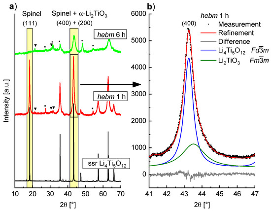 Formation of α-Li2TiO3 is also observed by milling of Li4Ti5O12 with spinel type structure. PXRD measurements of Li4Ti5O12 before and after milling in WC tools at 400 rpm are shown in Figure 8a. After a milling time of 1 h a slight asymmetric broadening of the (400) reflection is visible, while the (111) reflection is not as strongly affected and shows little asymmetry. This is caused by the formation of α-Li2TiO3 whose reflections overlap with the spinel reflections. In Figure 8b the Bragg intensities of the spinel (400) and the α-Li2TiO3 (200) reflection are shown with the resulting Rietveld fit. The (111) reflection of the spinel phase vanishes completely after a milling time of 6 h. Though a phase with cubic structure is formed, the intensities are very low and additional unidentified reflections are visible. Even after these mild milling conditions, the structure of the spinel phase is strongly altered, which may have large impact on the use of mechanochemically treated Li4Ti5O12 as anode material in battery applications. It has already been established by impedance spectroscopy that milling of Li4Ti5O12 leads to an increase in conductivity [18]. This may be due to this partial structure transformation of spinel Li4Ti5O12 to α-Li2TiO3.