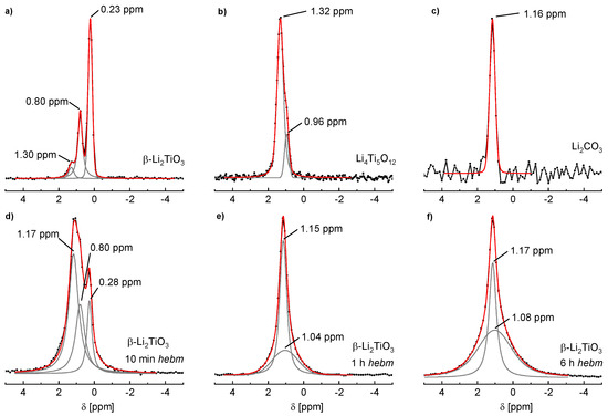 6Li SPE MAS NMR spectra of (a) β-Li2TiO3; (b) spinel Li4Ti5O12; (c) Li2CO3; (d) β-Li2TiO3 after hebm for 10 min; (e) 1 h and (f) 6 h. All spectra were referenced against solid LiCl and fitted with one, two or three independent Voigt functions with R2 > 0.99.