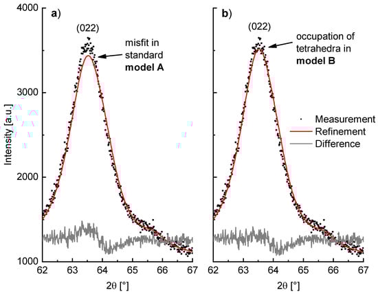 As a consequence of this adapted model, the Rietveld refinement of milled β-Li2TiO3 (WC tools, 600 rpm, 6h) is improved. This can be seen particularly in the description of the 022 reflection, which is depicted in Figure 11 with a fit using the (a) standard model A and (b) the adjusted model B. To better accommodate the shape of the amorphous background, a polynomial of 25th degree was used in these both cases, instead of the elsewise-used polynomial of 15th degree. Both the RBragg value of the Li2TiO3 phase and the overall fit are improved in model B. The GOF is reduced from 1.13 in model A to 1.11 in model B, which is only slightly better but nonetheless indicating an improvement. Beyond that, the RBragg value, which only dependents on the agreement between observed and calculated reflection intensities of the phase, is significantly lowered from 0.60% in model A to 0.28% in model B. However, since Li has a very low X-ray scattering factor the obtained values for the site occupancies in Table 1 are just an indication of an occupation of the tetrahedral site and cannot be regarded as proof. Nevertheless, this model helps to harmonize the results of the Rietveld refinement with the fitted areas of the signals of tetrahedral and octahedral environments in the 6Li SPE MAS NMR spectrum of milled β-Li2TiO3 (WC tools, 600 rpm, 6 h). The areas in the 6Li spectrum sum up to a proportion of 0.59 to 1 for tetrahedral- and octahedral-coordinated lithium, which corresponds to 37% tetrahedrally-coordinated lithium. The phase fraction from Rietveld refinement with model A (7% Li2CO3, 90% α-Li2TiO3 or 10.2 mol % Li2CO3 and 88.3 mol % α-Li2TiO3) corresponds to only 10% tetrahedrally coordinated lithium, solely arising from Li2CO3. This is far below the 37% from the 6Li spectrum. If tetrahedrally-coordinated lithium in α-Li2TiO3 from model B (6.2% Li2CO3, 91.1% α-Li2TiO3 or 9.0 mol % Li2CO3 and 89.5 mol % α-Li2TiO3) is factored in, a portion of 30% tetrahedrally-coordinated lithium is obtained, which fits the portion of the Li NMR spectrum. Here, a sof of 0.07 for Li on the 8c site (Li_T) corresponds to 21% of tetrahedrally coordinated lithium in α-Li2TiO3.