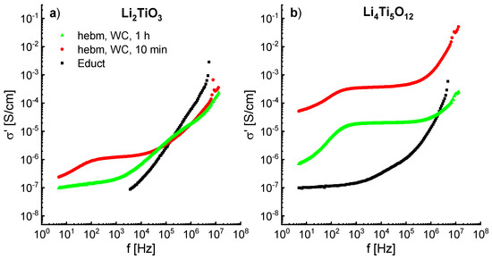 Since ball milling leads to the formation of defects, structure deformations and amorphization, an influence on the ion conductivity can be expected. The impedance spectra of ball-milled Li2TiO3 (600 rpm) and Li4Ti5O12 (400 rpm) show an increase in conductivity of up to three orders of magnitude. The frequency dependent real part of the conductivity is shown in Figure 12a,b. The spectra were recorded at 298K.