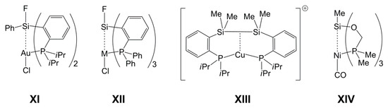 In reactions with 7-azaindolylsilanes, Pd(II) already proved to be a suitable candidate for forming paddlewheel-complexes with TM→Si bonds and TM-bound pyridine moieties (e.g., in II). In addition to d8 systems, other electron rich TMs may also be capable of forming complexes with TM→Si bonds, as shown by Bourissou et al. for the Au(I)→Si system (e.g., XI, Chart 2), in which the d10 metal is the electron pair donor [34,35,36]. Furthermore, for compounds XII (M = Cu, Ag, Au), Kameo et al. have shown that Cu(I) and Ag(I) are weaker donors [37]. In this context, we need to note that a previous study by Bourissou et al. [38] revealed an interaction between the Si–Si σ-bond electron pair of a disilane (as donor) and Cu(I) (as acceptor) (XIII). Similar systems (with rather weak d10 metal–silicon interaction) have been investigated for Ni(0), Pd(0), and Pt(0) by Grobe et al. (e.g., XIV) [39,40,41]. Whereas Au(I), Ni(0), Pd(0), and Pt(0) are more susceptible to phosphine ligands, Cu(I) represents a d10 system likely to bind to more than one or two N-donor ligands, and thus we included Cu(I) (as CuCl) in our investigations.