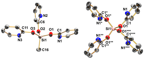 For the starting materials, we synthesized MeSi(pyO)3 via triethylamine supported reaction of MeSiCl3 and 2-hydroxypyridine, and Si(pyO)4, via transsilylation, with the preceding synthesis of Me3Si(pyO), which is known in the literature [26] (Scheme 1). Both of the silanes formed crystals suitable for single-crystal X-ray diffraction analysis (Figure 1 and Table 1). In both of the compounds, the Si atom is essentially tetracoordinate and the coordination sphere may be described as (4 + 3) in MeSi(pyO)3 and (4 + 4) in Si(pyO)4, because of the pyridine N atoms, which are capping the faces of the tetrahedral coordination spheres from distances close to the sum of the van-der-Waals radii (ranging between 2.91 and 3.03 Å). This tetracoordination of Si in Si(pyO)4 is in contrast to the Si hexacoordination in the thio analog Si(pyS)4 [27] (and other pyS-bearing Si compounds [28]), in which two of the 2-mercaptopyridyl ligands form four-membered chelates, and in complexes of the N-oxide of the pyO system, which forms five-membered chelates [29,30].