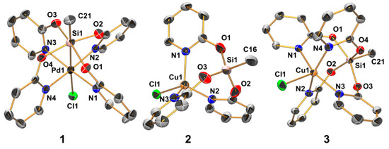 Molecular structures of compounds 1 (in 1 · 2 CHCl3), 2, and 3 in the crystal; thermal displacement ellipsoids are drawn at the 50% probability level; H atoms are omitted for clarity and selected atoms are labeled. For compound 2, only one of the two crystallographically independent (but conformationally similar) molecules is depicted. The selected interatomic distances (Å) and angles (deg) for 1 are as follows: Pd1–Si1 2.627(1), Pd1–Cl1 2.891(1), Pd1–N1 2.023(3), Pd1–N2 2.039(3), Pd1–N3 2.028(3), Pd1–N4 2.013(3), Si1–O1 1.785(2), Si1–O2 1.775(2), Si1–O3 1.789(2), Si1–O4 1.780(2), Si1–C21 1.853(4), Pd1–Si1–C21 177.88(12), Cl1–Pd1–Si1 177.36(3), N1–Pd1–N3 170.10(11), N2–Pd1–N4 170.91(11), O1–Si1–O3 163.66(12), O2–Si1–O4 163.72(12); for 2: Cu1–Cl1 2.361(1), Cu1–N1 2.038(2), Cu1–N2 2.039(2), Cu1–N3 2.023(2), Cu1···Si1 3.204(1), Si1–O1 1.626(2), Si1–O2 1.629(2), Si1–O3 1.618(2), Si1–C16 1.834(3); O1–Si1–C16 106.11(12), O2–Si1–C16 106.90(14), O3–Si1–C16 106.05(14), O1–Si1–O2 111.41(13), O1–Si1–O3 113.91(12), O2–Si1–O3 111.89(12); and for 3: Cu1···Si1 2.919(1), Cu1–Cl1 2.403(1), Cu1–N1 2.023(2), Cu1–N2 2.055(2), Cu1–N3 2.025(2), Cu1–N4 2.049(2), Si1–O1 1.753(2), Si1–O2 1.757(2), Si1–O3 1.753(2), Si1–O4 1.755(2), Si1–C21 1.847(2); Cu1–Si1–C21 177.51(6), Cl1–Cu1–Si1 178.24(2), N1–Cu1–N3 159.32(5), N2–Cu1–N4 158.66(5), O1–Si1–O3 154.22(6), and O2–Si1–O4 155.83(6).
