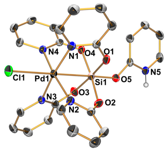 The coordination number of tetravalent silicon can easily be enhanced (up to five or six) with the aid of monodentate or chelating ligands [1,2,3,4]. In some of our studies, we have also shown that late transition metals (Ni(II), Pd(II), and Pt(II)) may serve the role of a lone pair donor at hexacoordinate silicon, for example, in I and II (Chart 1) [5,6,7,8]. That kind of complexes with silicon as a lone pair acceptor in the coordination sphere of a transition metal (TM) thus complements TM silicon complexes with, e.g., silylene ligands, in which the Si atom is the formal lone pair donor, such as III, IV, and V [9,10,11,12,13], and the silyl complexes, in which the TM–Si bond is one out of four bonds to a tetravalent Si atom (e.g., VI, VII, VIII, and IX) [14,15,16,17,18]. In complex IX and some other compounds with group 9 metals [19,20,21,22], the 2-pyridyloxy (pyO) ligand was successfully utilized for stabilizing the TM–Si bond by forming two bridges over the heterodinuclear core. Some other compounds have been reported, in which one pyO ligand bridges the TM–Si bond (e.g., X, and some others) [23,24,25]. In all of these Si(µ-pyO)TM compounds, the ambidentate pyO ligand is bound to silicon via the Si–O bond, while the softer Lewis base (pyridine N atom) is TM bound. This structural motif should enable access to a new class of paddlewheel-shaped complexes with formally dative TM→Si bonds, in which the Si atom may carry a sterically more demanding group or alkyl group, because of the rather poor steric demand of the surrounding donor atoms (i.e., O atoms), whereas in the previously reported TM→Si paddlewheel complexes (such as I and II), the donor atom situation at silicon merely allowed for the presence of a small electronegative H-acceptor moiety (i.e., a halide).