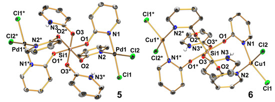 Molecular structures of 5 and 6 in the crystal (5 in the structure of solvate 5 · 6 CHCl3); thermal displacement ellipsoids are drawn at the 30% probability level; C-bound H atoms are omitted for clarity and selected atoms are labeled. In both cases, the Si atom is located on a crystallographically imposed center of inversion, and therefore the asymmetric unit consists of a half molecule and the symmetry related sites (e.g., O1 and O1* at Si1) are trans to each other. Selected bond lengths (Å) and angles (deg) for 5 are as follows: Pd1–Cl1 2.290(1), Pd1–Cl2 2.303(1), Pd1–N1 2.028(2), Pd1–N2 2.036(2), Si1–O1 1.794(2), Si1–O2 1.760(2), Si1–O3 1.770(2), N1–Pd1–Cl1 175.93(7), N2–Pd1–Cl2 176.15(7), Cl1–Pd1–Cl2 91.60(3), Cl1–Pd1–N2 88.91(7), Cl2–Pd1–N1 87.65(7), and N1–Pd1–N2 92.10(9); for 6: Cu1–Cl1 2.238(1), Cu1–Cl2 2.256(2), Cu1–N1 2.008(4), Cu1–N2 1.990(4), Si1–O1 1.790(3), Si1–O2 1.770(3), Si1–O3 1.755(3), N1–Cu1–Cl1 153.97(12), N2–Cu1–Cl2 162.50(12), Cl1–Cu1–Cl2 93.69(5), Cl1–Cu1–N2 90.82(11), Cl2–Cu1–N1 90.31(12), and N1–Cu1–N2 93.03(16).