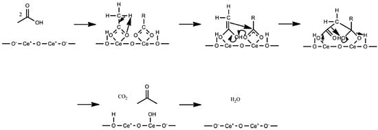 Crude oil is a finite feedstock and attempts are being made to extend the shelf life of infrastructure and chemical processes that rely on its use by producing sustainable bio-derived fuels and chemicals [,]. For example, certain seeds, plants, and algae can be processed to afford oils, where the majority of the non-polar oil components are in the form of triacyl glycerides (TAGs), consisting of an ester of glycerol bearing three saturated or unsaturated fatty acid residues []. These TAGs can be readily hydrolysed to form glycerol, itself a potential source of fuels and chemicals, and free fatty acids (FFA) []. The resulting FFAs can be treated in a number of ways to afford a range of valuable chemical products such as diesel-like fuels, lubricants and gasoline [,]. A particularly important derivatisation pathway is ketonic decarboxylation (or ketonisation), whereby two carboxylic acid molecules react to form a ketone with loss of water and carbon dioxide. Depending on the nature of the starting carboxylic acids, the resulting FFA-derived ketones are potentially useful, environmentally-sustainable feedstocks for use in diesel fuels, lubricants, as surfactant precursors, or as substrates for further functionalisation, for example, via cracking or hydrotreatment to afford hydrocarbons and hydroxyalkylenes [,]. A simple example of a ketonic decarboxylation reaction and a proposed mechanism is presented in Figure 1. Here, a solid ceria catalyst was used to convert acetic acid (used as a model FFA) to acetone [].