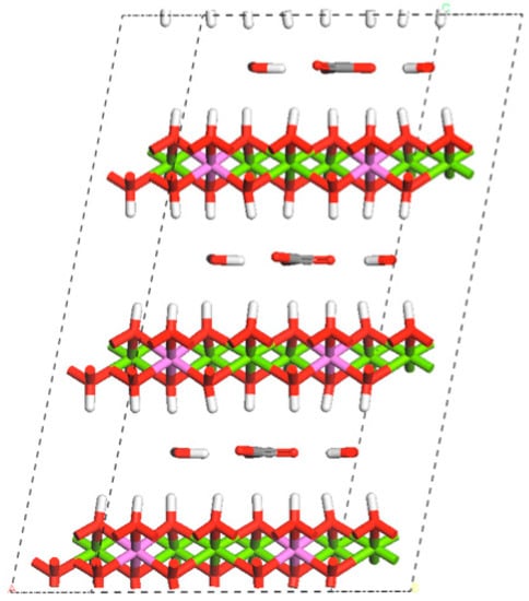Schematic representation of a carbonate-containing Mg/Al layered double hydroxide super cell showing layered structure and interlayer water. Colour code: Mg = magenta; Al = green; O = red; C = grey; H = white. Dashed lines show periodic cell boundaries.
