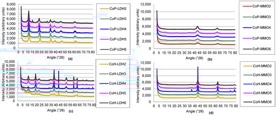 Powder X-ray diffraction patterns for LDH prepared via co-precipitation and their corresponding, thermally-generated MMOs: (a) CoP-LDH; (b) CoP-MMO; (c) CoH-LDH; and (d) CoH-MMO.