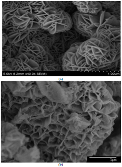 Scanning electron micrograph of prepared layered double hydroxide materials showing: (a) CoP-LDH-2; and (b) CoH-LDH-2.