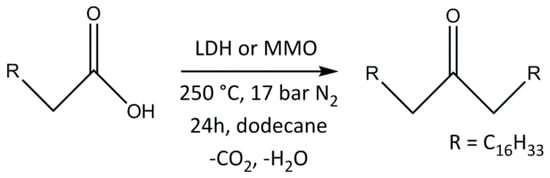 LDH-/MMO-mediated ketonic decarboxylation of stearic acid to stearone.