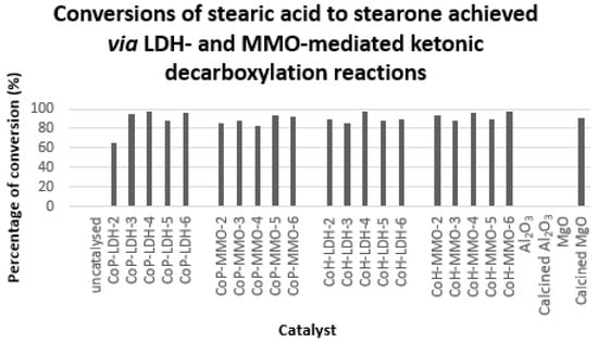 In the study presented here, all MMO and LDH materials brought about the same degree of stearic acid conversion to stearone within error (Figure 6). This suggests that in this transformation the MMO and LDH catalysts are of similar reactivity, something supported qualitatively by the qualitative Hammett indicator-based assessment of basicity (vide supra). Furthermore, since during ketonic decarboxylation, water and carbon dioxide are both lost from the reacting carboxylic acid molecules, it may be reasonable to suggest that this may lead to partial reconstruction of the MMO materials back to LDH-like systems (a well-established phenomenon []), something that is likely to be most prevalent at the surfaces of the oxides rendering the materials essentially identical. Conversely, at a reaction temperature of 250 °C, TGA analysis clearly identified that the LDH catalysts undergo partial dehydroxylation to form MMO phases. As such, under the test conditions employed in the ketonisation reactions described herein, the reactive surfaces of the LDH and corresponding MMO materials are likely to have similar structure and reactivity, though it is notable that the increased surface area of the MMO materials over the LDHs does not seem to have an effect on performance. At present, no attempt has been made within this initial study to assess the reaction kinetics, and it is possible that the 24 h reaction period results in equilibrium being reached for both sets of catalyst. Work is ongoing to investigate the effect of both reaction time and temperature.