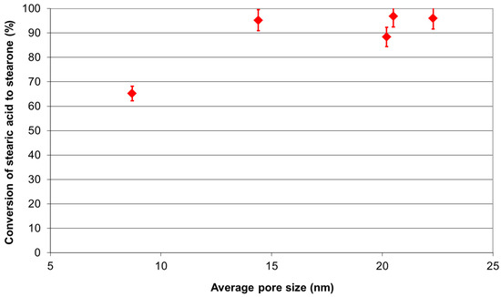 From our studies of various different CoP-LDH catalysts it can be seen that there is a relationship between average pore size and conversion of stearic acid to stearone (Figure 7). Converting two molecules of stearic acid, with an 18-carbon backbone chain, into stearone, with a 35-carbon backbone chain may be sterically hindered with the catalysts that exhibit small pore size. The data presented in Figure 6 show that, for CoP-LDH-2 to CoP-LDH-6, conversion to stearone was between 88% and 97%, for pore sizes of 14 nm and above, suggesting there is a lowest optimum pore size for this reaction. With the reaction converting two long chain fatty acid molecules into similarly long chain ketone product molecules, accessibility to catalytic sites may be sterically hindered by the small average pore size of CoP-LDH-2 (9 nm). Similar trends were not observed for tests carried out using the materials CoH-LDHs, CoP-MMOs or CoH-MMOs.