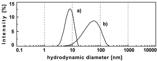 Hydrodynamic diameter of particles in as-prepared MgF2 sols (a) and in samples after boiling for 24 h (b) as measured by dynamic light scattering. Reproduced from Reference [36] with the permission of the Royal Chemical Society.
