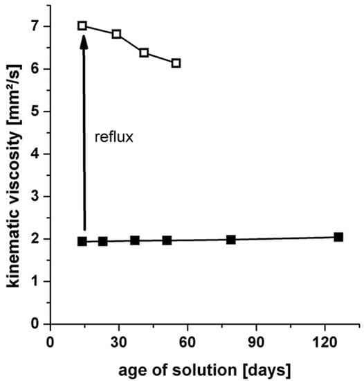 The long-term stability of MgF2 sols is crucial for the coating process. Nanoparticles, after sol–gel synthesis, tend toward gelation or agglomeration. To control the stability, the change of viscosity of the sols over a time of 120 days was measured (Figure 2). Only a minimal increase (0.01 mm2·s−1) over this time was observed, meaning these sols are very stable. After the thermal treatment, the viscosity was significantly higher. It seems that the sol system may be altered by introduction of thermal energy.