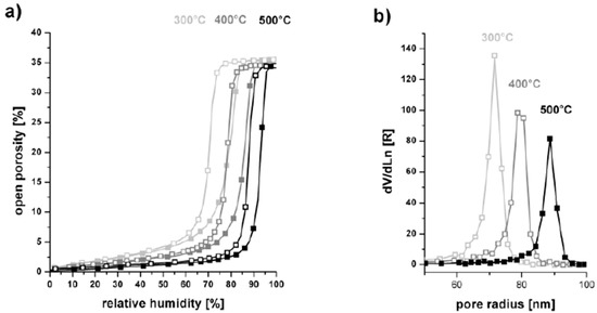 Adsorption (filled symbols) and desorption (open symbols) isotherms of MgF2 thin films treated at 300, 400, and 500 °C, measured by ellipsometric porosimetry (a). Derivative pore radius distributions as calculated from the respective desorption branch (b). Reproduced from Reference [36] with the permission of the Royal Chemical Society.