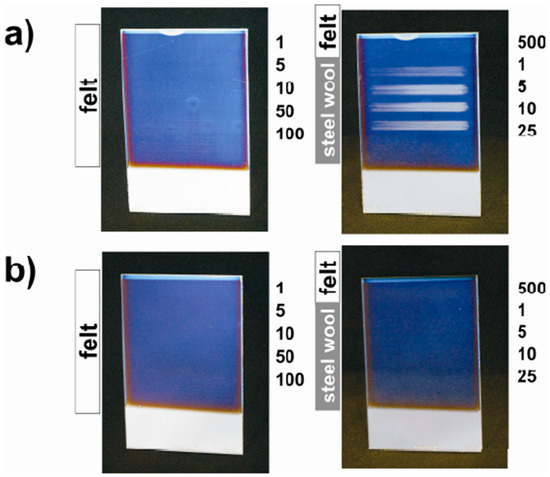 Photographs of MgF2 thin films on (a) soda-lime and (b) borosilicate glass substrates that had undergone the Crockmeter test with felt and steel wool. The numbers at the right side of the images correspond to the respective number of abrasion cycles. All samples have been treated at 500 °C prior to analysis. Reproduced from Reference [36] with the permission of the Royal Chemical Society.