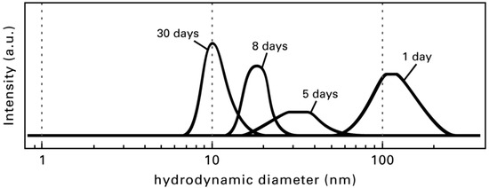 Particle size distribution measured by DLS depending on the sol age. Reproduced from Reference [37] with the permission of the Royal Chemical Society.