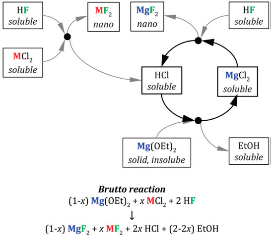 Schematic representation of the reactions occurring during the one-pot synthesis using the chloride method (M = Mg, Ca; x = 0.05–0.30; Et = C2H5). Reproduced from Reference [40] with the permission of the Royal Chemical Society.