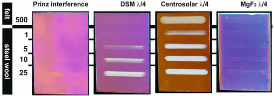 Photographs of antireflective coatings subjected to Crockmeter testing using felt (500 cycles) and steel wool (1–25 cycles) as abrasive. The size of the samples shown is 10 × 15 cm². Reproduced from Reference [42] with the permission of the Royal Chemical Society.
