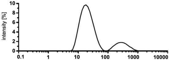 In 2015, Rehmer et al. [46] reported for the first time the application of nanoscopic CaF2 via the fluorolytic sol–gel synthesis route for antireflective coatings. The synthesis of transparent CaF2 sol starting from calcium alkoxides was not successful because of the insolubility of the alkoxides in the alcohols used. Calcium acetate suspended in mixtures of ethanol and acetic acid provides transparent CaF2 sols, but the stability of these sols is very poor. After a few days, a gel is formed due to the esterification of the acetic acid with ethanol forming water. The best suitable starting material to form CaF2 via sol–gel synthesis is CaCl2. First, the resulting sol is not fully transparent, but opaque. However, after the addition of 5 mol % TMOS as a stabilization agent, a water-clear transparent CaF2 sol is formed. The particle size distribution of the CaF2 sol is given in Figure 10. The intensity weighted distribution shows two classes of particles with a mean particle size of 20 nm.