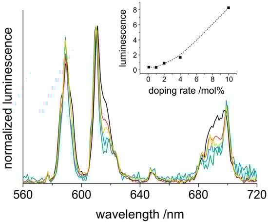 Luminescence emission spectra of 0.2 M sols of CaF2:Eux with x = 0.1 (green), 1 (blue), 2 (orange), 4 (red), and 10 (black), excited at 393 nm. The inset shows the integrated emission area in the 560–720 nm range. Reproduced from Reference [57] with the permission of the Royal Chemical Society.