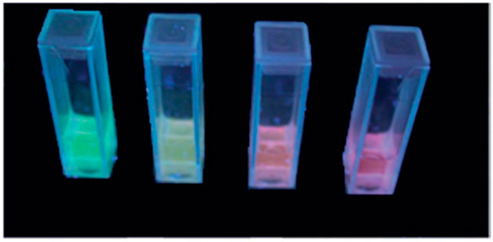 Picture of Eu3+- and Tb3+-doped CaF2 excited with 366 nm (from left to right: CaF2:Tb10, mixture of 52% of CaF2:Tb10, and 48% of CaF2:Eu10, CaF2:Eu4.8,Tb5.2, and CaF2:Eu10). Reproduced from Reference [57] with the permission of the Royal Chemical Society.