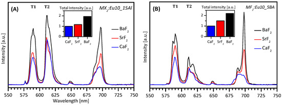 Comparison of the luminescence emission spectra of 0.2 M sols of CaF2:Eu10, SrF2:Eu10, and BaF2:Eu10 with 15 mol % of aluminium isopropoxide (A) or 5 mol % of benzoic acid (B) as an additive. T1: 5D0→7F1, T2: 5D0→7F2. Reproduced from Reference [58] with the permission of the Royal Chemical Society.