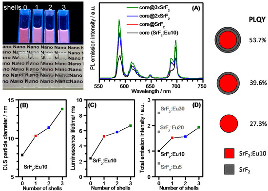 Core–shell particles SrF2:Eu10@n×SrF2 (n = 0–3). Upper left: Pictures at daylight and under UV excitation (366 nm). (A) PL emission spectra (ex. 393 nm); (B) DLS particle diameter (number); (C) Eu3+ luminescence lifetime (em. 590 nm); (D) luminescence intensity (ex. 393 m), particles with different amounts of Eu3+ doping are given for comparison. PLQY: Photoluminescence quantum yield. Reproduced from Reference [59] with the permission of the Royal Chemical Society.