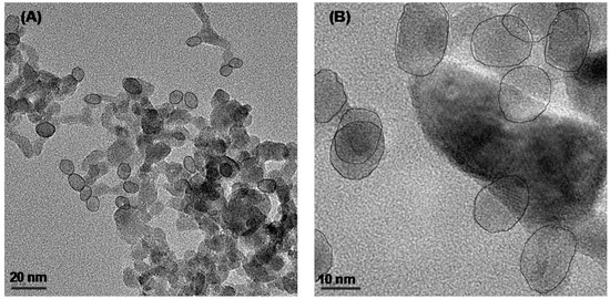 (A) Transmission electron microscopy (TEM) images of SrF2:Eu10 and (B) SrF2:Eu10@3×SrF2 (selected particles are surrounded by black lines). Reproduced from Reference [59] with the permission of the Royal Chemical Society.