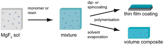 Scheme of composite preparation from MgF2 sols as thin film coatings or volume composites. Reproduced from Reference [62] with the permission of the Royal Chemical Society.