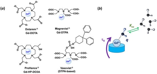 Several parameters govern the paramagnetic enhancement efficacy of a CA (or relaxivity, r1, expressed per millimolar concentration of Gd3+, in mM−1·s−1) but the main ones that can be tuned easily by the chemists while designing novel and more efficient CAs are: (1) the number of water molecules directly bound to the Gd3+ ion, q (hydration number); (2) the water exchange rate of these water molecules with those of the bulk, kex and (3) the rotational correlation time of the complex, τR [1]. A schematic representation of these parameters is depicted in Figure 1b.