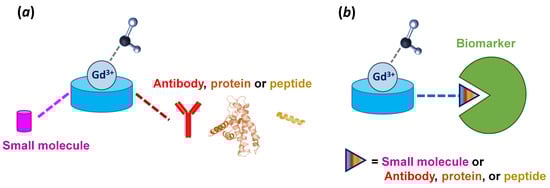 Different targeting moieties can be used to achieve a specific binding to the chosen biomarker. Figure 2 summarizes the type of moieties potentially used: in general, the probes are based on a chelating unit for the Gd3+ (aiming to guarantee a good kinetic inertness and thermodynamic stability of the metal complex but also the presence of at least one water molecule in the inner-sphere), which is conjugated to a small molecule, antibody, protein or peptide via a linker (its length and type can vary, ensuring that the good affinity towards the target is not affected by the presence of the metal complex). When bound to a highly concentrated biomarker in vivo (e.g., human serum albumin), the complex “MRI probe–biomarker” has a higher rotational correlation time, yielding higher relaxivity and hence a higher enhanced signal. If the biomarker is a receptor (lower in vivo concentrations), the signal enhancement results mostly from the high local concentration of the CA (multimeric-like effect).