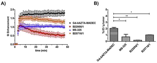 Kinetic study of MRI signal intensity enhancement in tumour of C57BL/6 mice transplanted subcutaneously with B16F10 melanoma cells, with intravenous injection (0.05 mmol Gd3+/kg) of Gd-AAZTA-MADEC (circles), Vasovist® (MS-325) (triangles), Gd-B22956/1 (squares) and Gd-B25716/1 (diamonds) (A) and the Gd3+ accumulation within tumour tissue at 60 min post-injection (B). Reprinted with permission from Ref. [26] (Copyright 2016 Elsevier).