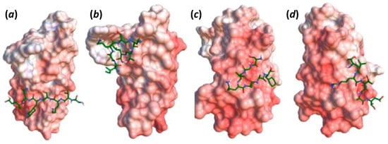 Electrostatic surface of extradomain-B fibronectin fragment (EDB) and 3D stick molecular models (C = green, N = blue, O = red and H = white) of peptides (a) GVK, (b) IGK, (c) SGV and (d) ZD2 fitted to the protein. For the surface of EDB, blue indicates positive charged residues, red represents negative areas and white are neutral regions. Reprinted with permission from Ref. [41] (Copyright, 2017, American Chemical Society).