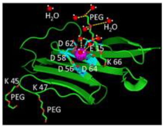 The stable coordination of Gd3+ is assured by the presence of five Aspartic acid (Asp or D) and Glutamic acid (Glu or E) carboxylic side chains or by incorporating unnatural amino acids into the sequence, whose coordination sphere is completed by two water molecules. The binding pocket design takes into account the good exposition of Gd3+ towards the bulk water, enabling an exchange to happen, essential for MRI. This coordination design has been optimized by computer simulations (Figure 7) and enabled the design of different CA’s. The first generation, ProCA1, has a relaxivity of 117 mM−1·s−1 at 1.5 T and 48 mM−1·s−1 at 3 T (medical fields) and a q of 2. The thermodynamic stability of these complexes is relatively low (log KML ≈ 12.1 [44]; while log KML(Gd-DTPA) ≈ 22.46 [1]) but improved stability has been achieved for the latest generation ProCA3, displaying a log KML of 21.6 [46]. Nonetheless, this first generation showed good stability (no transmetallation) when tested under conditions simulating the extracellular environment and no effect of other biological metal ions on the relaxivities of ProCAs was observed [46]. Further improvement of this generation of CA included its PEGylation for a better blood half-life, which also resulted in an increase of 30–100% in their relaxivity.