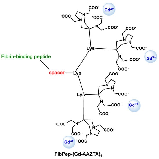 Aime et al. followed a similar approach to that of Caravan and co-workers, developing an AAZTA-tetramer conjugated to the same fibrin-binding peptide used for EP-2104R (XnCPYGLCXm) [40]. This novel probe—FibPep-(Gd-AAZTA)4 (Scheme 5)—relies on four Gd-AAZTA(CH2)4COOH units, which are coupled to a trilysine scaffold, functionalized with a maleimide function, which is then conjugated to the cyclic 11-amino acid fibrin-binding peptide (FibPep), previously reported by Caravan et al. [36].