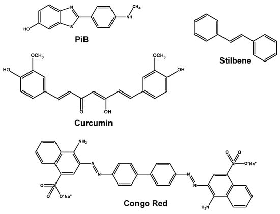 Structures of small molecule derivatives for Aβ targeting: Pittsburgh compound B (PiB), curcumin, stilbene and Congo Red.