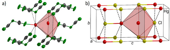 Comparison of the crystal structures of Hg2[dca]2 and calomel, Hg2Cl2. (a) Coordination sphere of Hg in Hg2[dca]2. The atomic displacement ellipsoids correspond to 90% probability using the refined ADPs. (b) Crystal structure of Hg2Cl2 [26].
