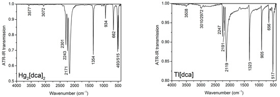 Infrared spectra of Hg2[dca]2 (left) and Tl[dca] (right).
