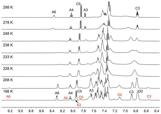 Aromatic region in the variable temperature 1H NMR spectra of [Cu(xantphos)(tBuSPy)][PF6] (500 MHz, acetone-d6). At 198 K, the major species is represented by black labels, and minor species by red labels. See Materials and Methods Section for full assignment of major species.